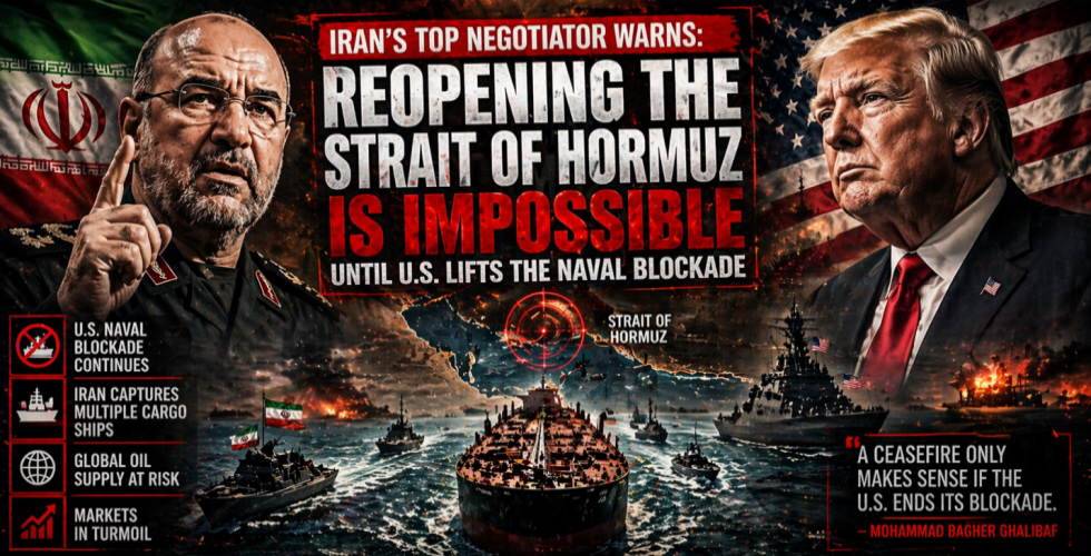 Iran’s top negotiator and parliamentary speaker Mohammad Bagher Ghalibaf has taken a firm position regarding the future of the Strait of Hormuz, declaring that reopening the vital waterway is currently impossible under existing conditions. His remarks come as tensions remain high despite the fragile ceasefire announced between Washington and Tehran. The statement reflects how fragile the diplomatic environment remains. Energy markets reacted immediately. Ghalibaf argued that a true ceasefire cannot exist while the United States maintains what Iran describes as a naval blockade.