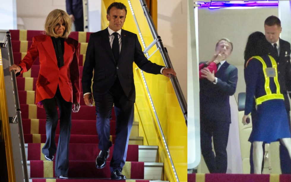 The French president lands in Vietnam, the door of the government plane opens, and suddenly, Emmanuel Macron puts his hand to his face. What appears to have been a resounding slap in the face from his wife, Brigitte, was said to have been something else entirely, according to the