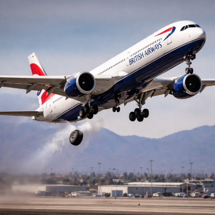 A British Airways aircraft lost a wheel shortly after taking off from Harry Reid International Airport in Las Vegas, raising concern but causing no injuries. Despite the technical failure, the flight continued its journey to London, where the aircraft landed safely. The aircraft involved was an Airbus A350-1000 that had just begun its